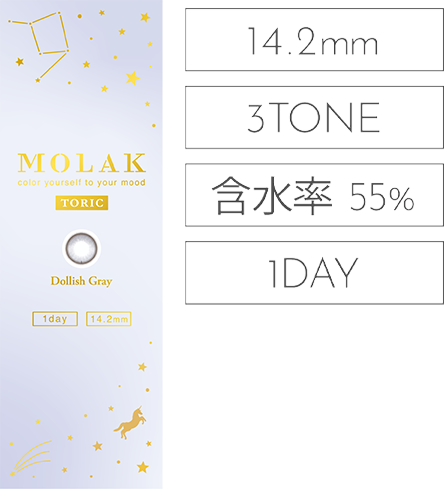 『MOLAKドーリッシュグレー』、『MOLAKドーリッシュグレートーリック』は同じカラー名での販売となりますが、度なしを含む近視用・乱視用において発色や装用感などが異なります。近視用と乱視用を⽚目ずつ装着する場合はご注意ください。
