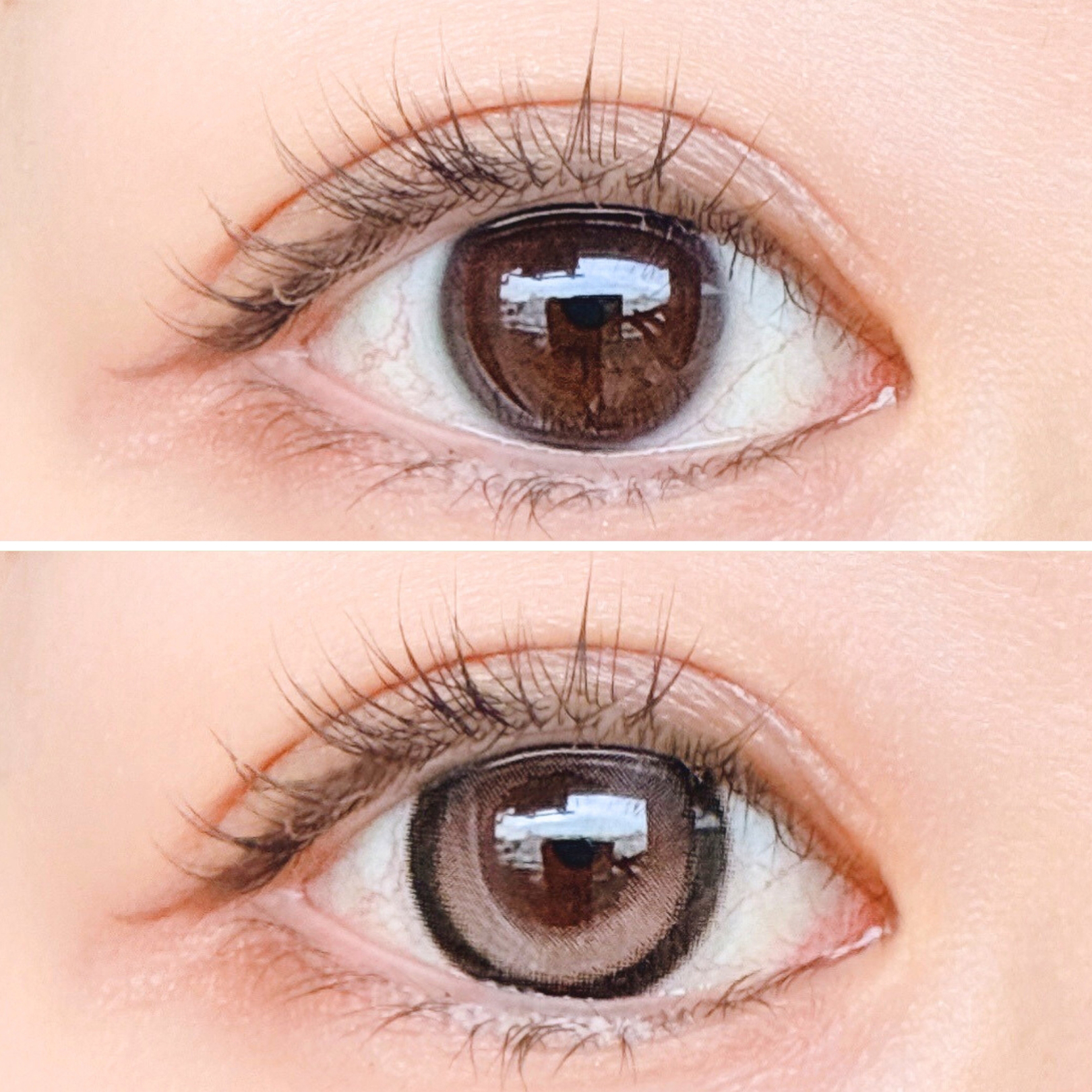 マンスリーレンズは、 ブラウンのトーンが落ち着いた赤みを帯びたブラウンに見え、フチも際立つため瞳が存在感のある印象的な仕上がりに♡